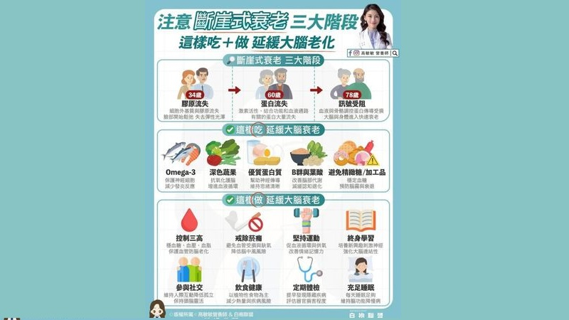 你有沒有發現照鏡子時,突然覺得皺紋變多了?健檢突然多了紅字!或是自己好像比以前更容易變胖、疲倦、生病,好像一下子老了好幾歲一樣,知名營養師高敏敏表示,其實老化每天都在發生,但研究發現有3個關鍵時間點會像「斷崖」一樣突然加速下滑。不過老化雖然無法避免,卻能靠飲食和生活習慣來延緩,只要平常做好準備,就能幫助大腦保持清晰、青春久一點。