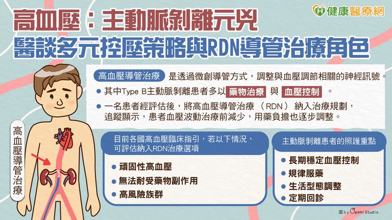不過醫師強調,導管治療並非所有患者都需要,多數主動脈剝離患者仍以規律服藥、生活型態調整與定期追蹤為主。是否適合接受高血壓導管治療,仍須依個別病況、檢查結果與專科醫師評估綜合判斷。